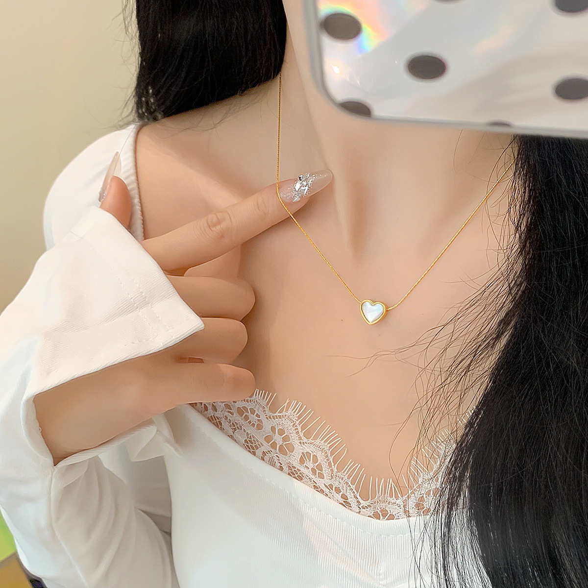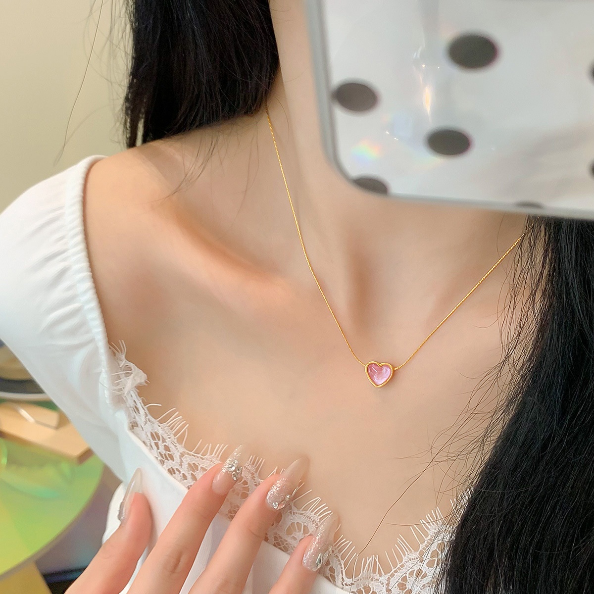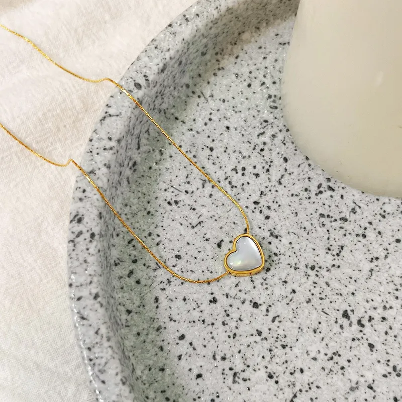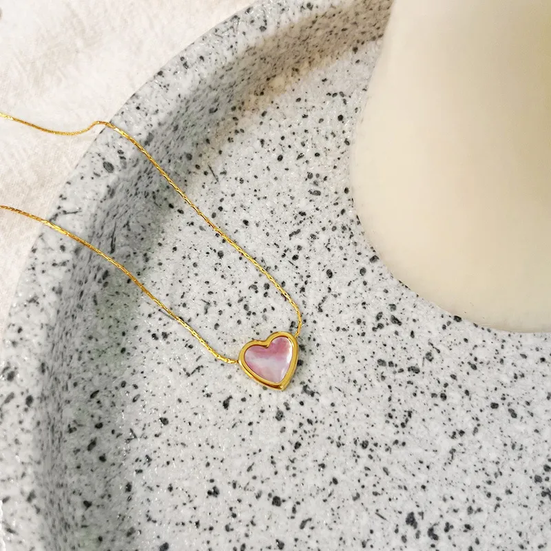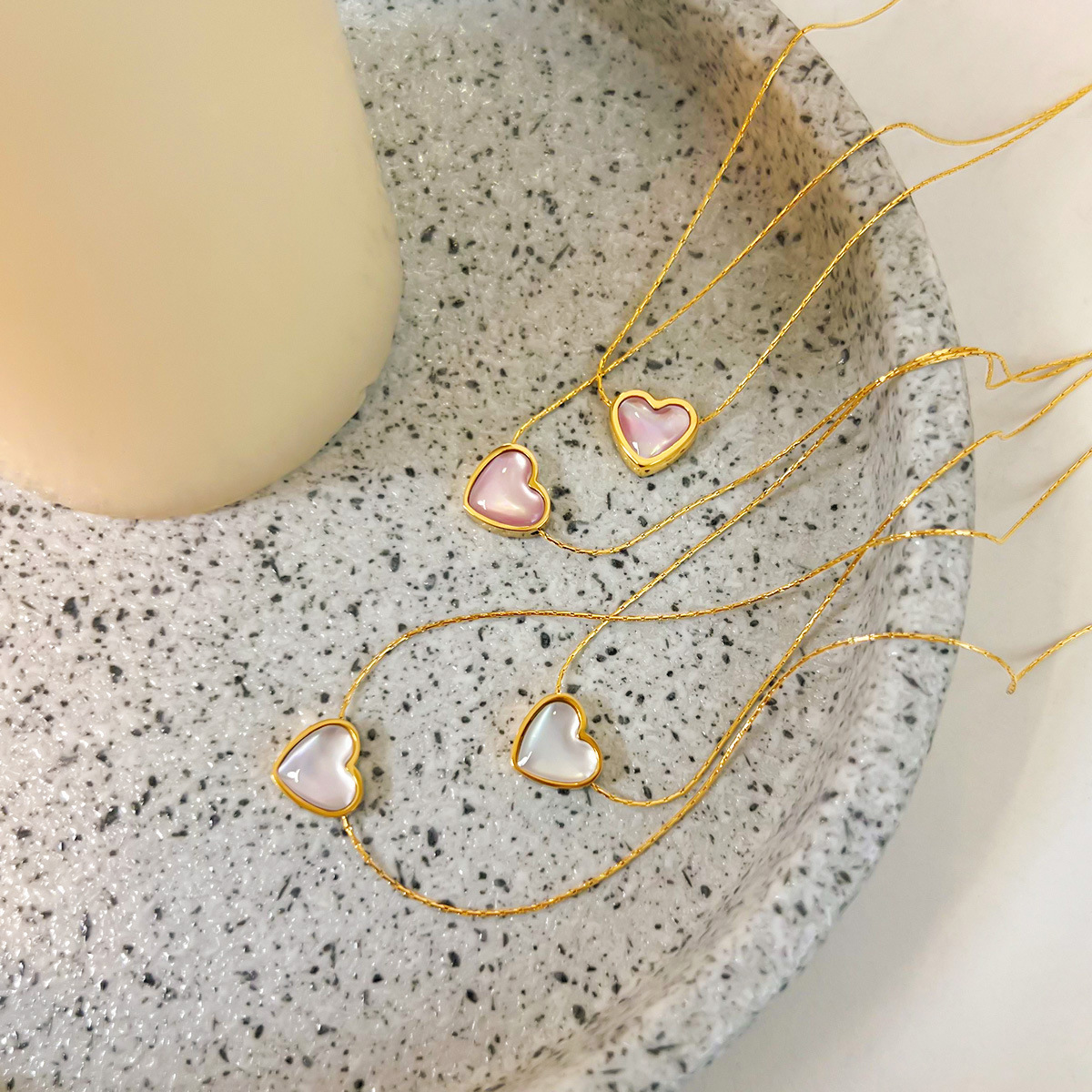 ✨ Dije de corazón con hermoso acabado nacarado. ✨ Disponible en dos tonos: Blanco Puro y Rosa Romántico. ✨ Cadena tipo laminada brillante y delicada. 🌟 Acero inoxidable de larga duración.