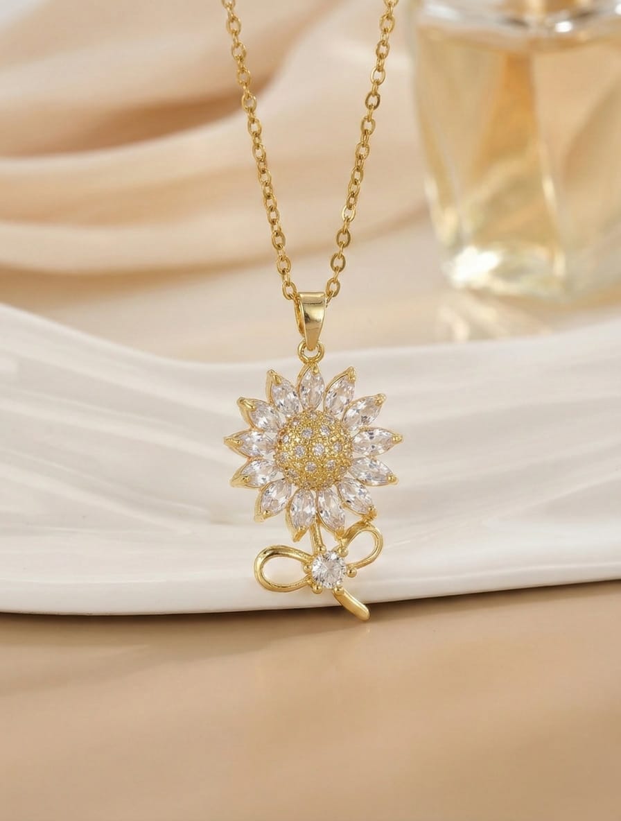 Collar con dije de girasol y detalle de lazo De acero y Zircón blanco incrustado