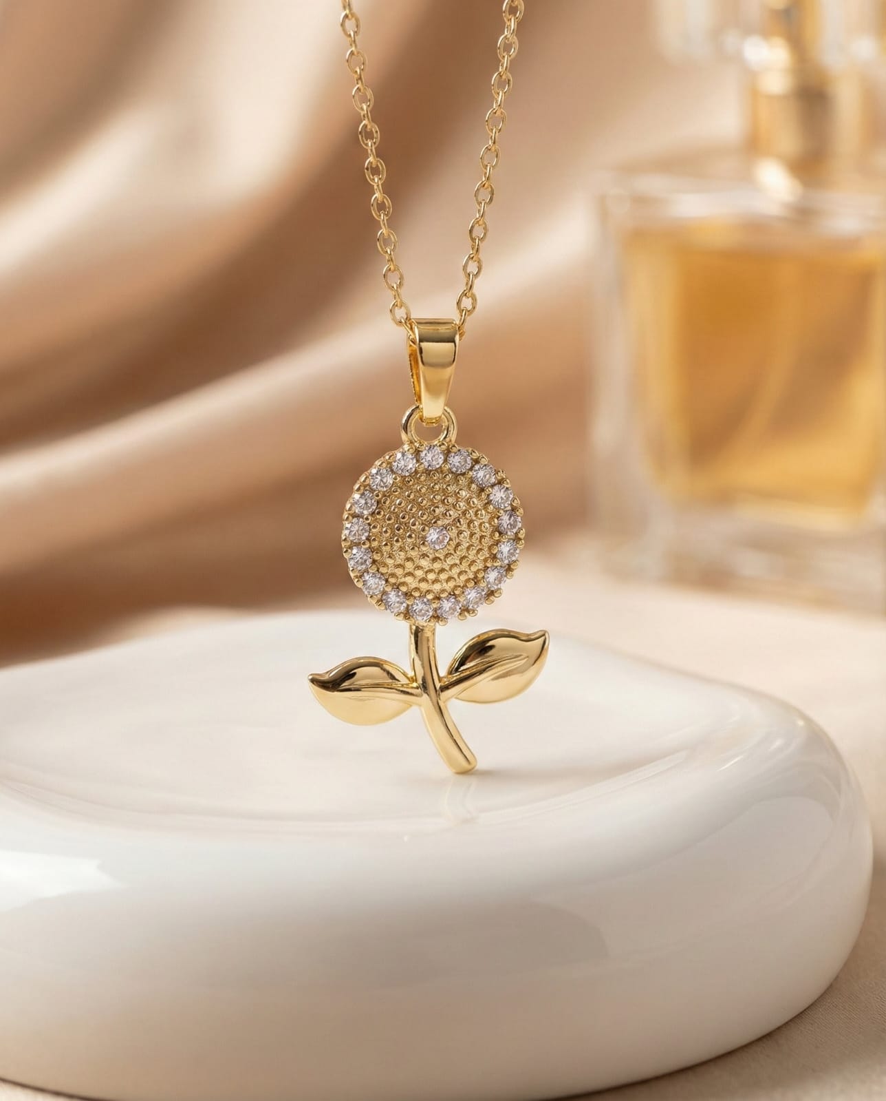 Diseño exclusivo con centro texturizado en relieve ✨ Halo de cristales de Zircón transparentes para un brillo sutil 💎 Acero inoxidable dorado de larga duración 💛
