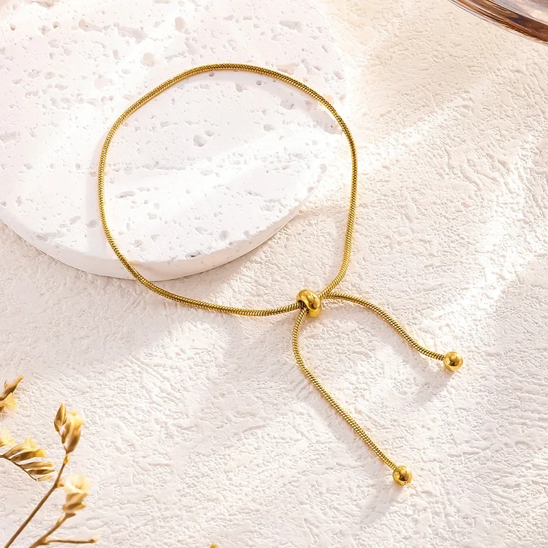 Pulsera dorada con cadena de estilo serpiente y cierre ajustable deslizante. Un diseño sofisticado y cómodo que se ajusta a tu medida perfecta. Ideal para darle un brillo sutil a tu día a día