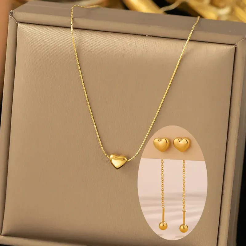 Juego de collar y aretes largos ✨ Dije de corazón con acabado liso y brillante 💫 De acero inoxidable dorado de alta calidad 🌟